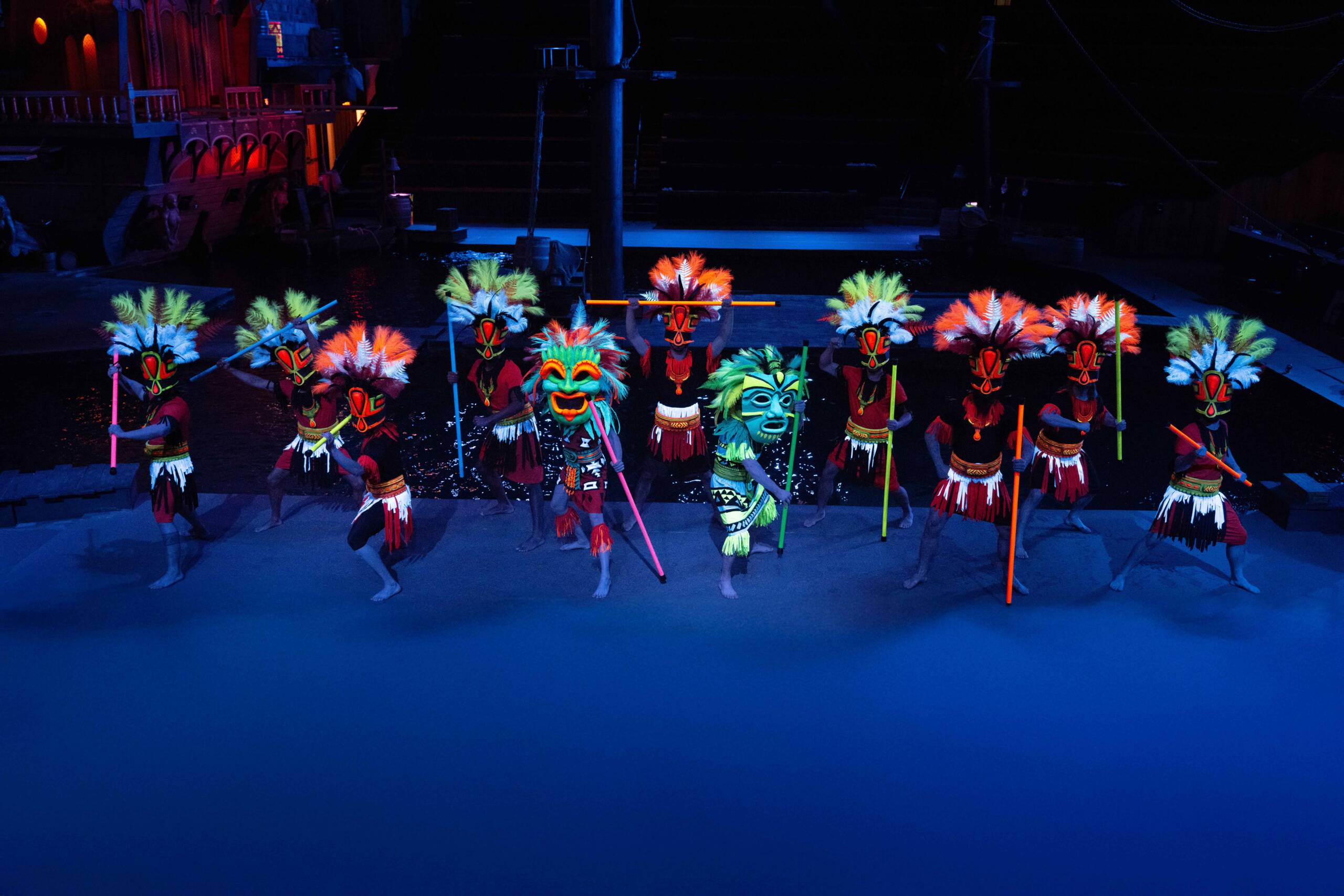 Pandemonium breaks out in an unbelievable battle with sword fighting, cannons blazing, pirates scaling masts, and swinging ship to ship, fighting to win the coveted Davey Jones sunken treasure. Feel the heat of a lagoon of fire, shiver as skeletons appear from the deep and sky above during a fierce storm. Even Salty the sea lion joins the action and beautiful mermaids gracefully perform before diving back into the sea.